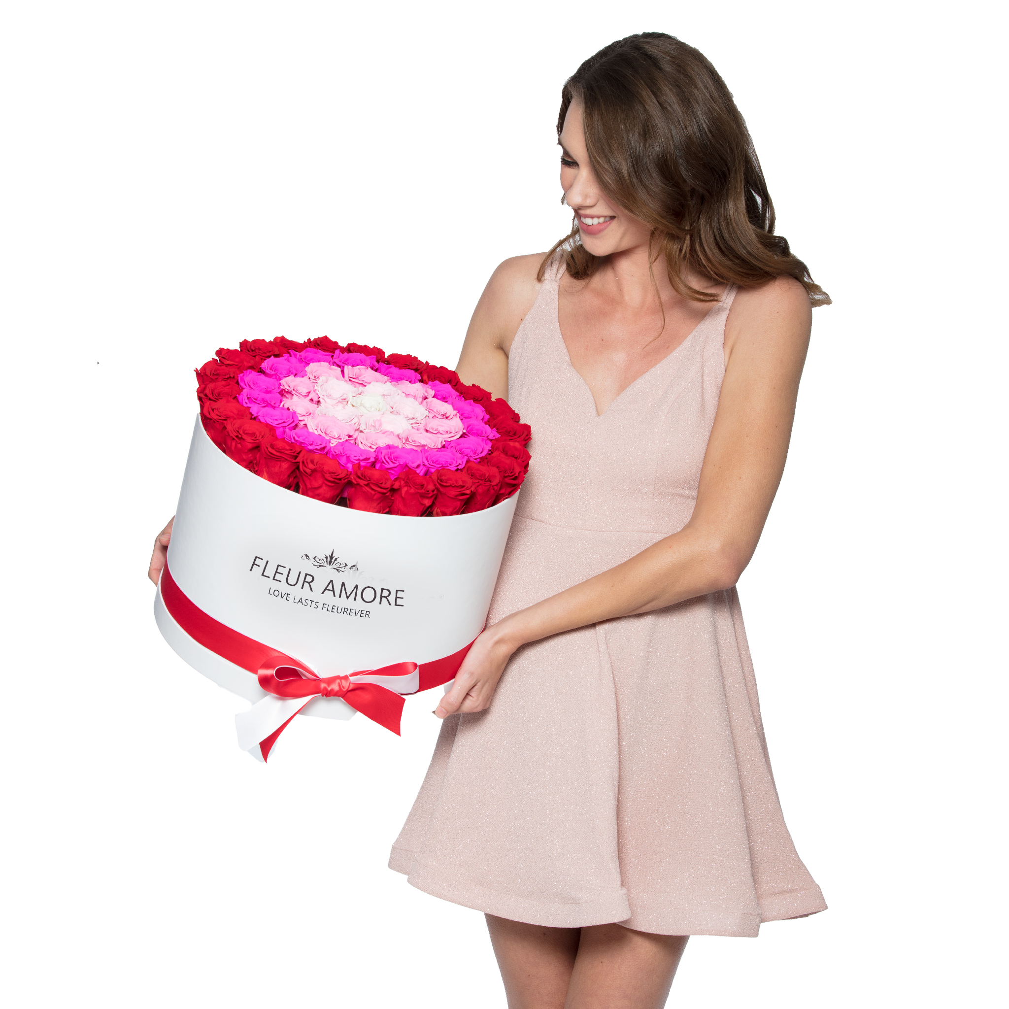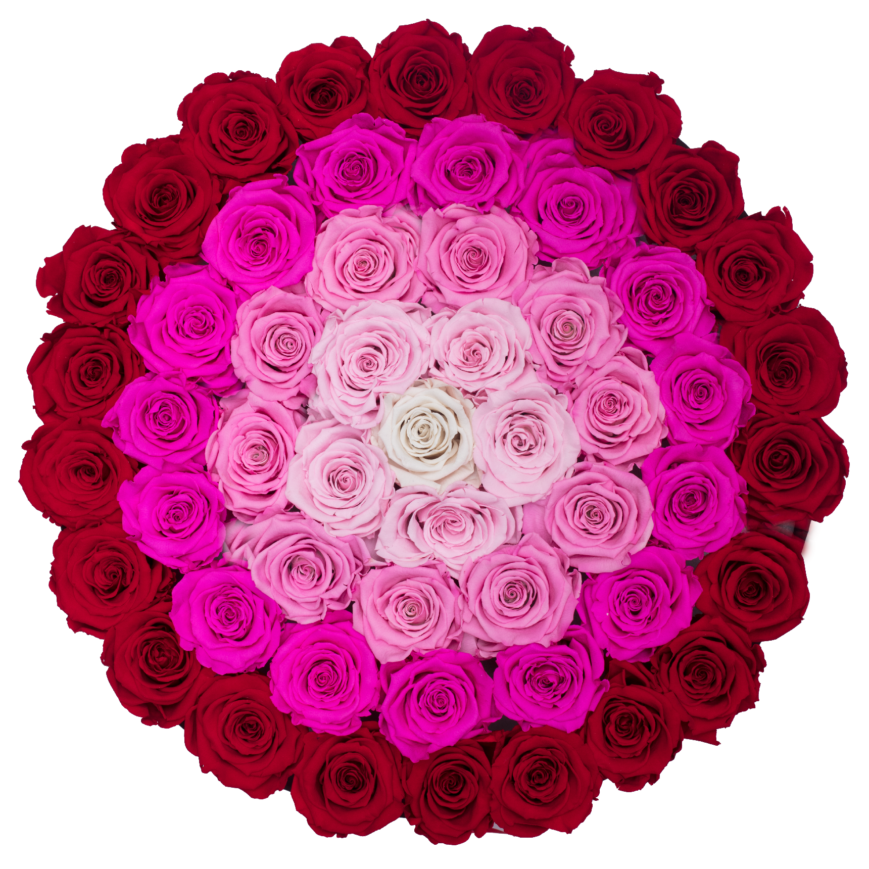 Everlasting Rose® color: Dark Red, Hot Pink, Pink, Light Pink and White Number of Everlasting Rose®: 60 ~ 65 roses Rose box diameter: 15 in Rose box height: 10 in Rose box color: White Everlasting Rose® diameter: 2 in