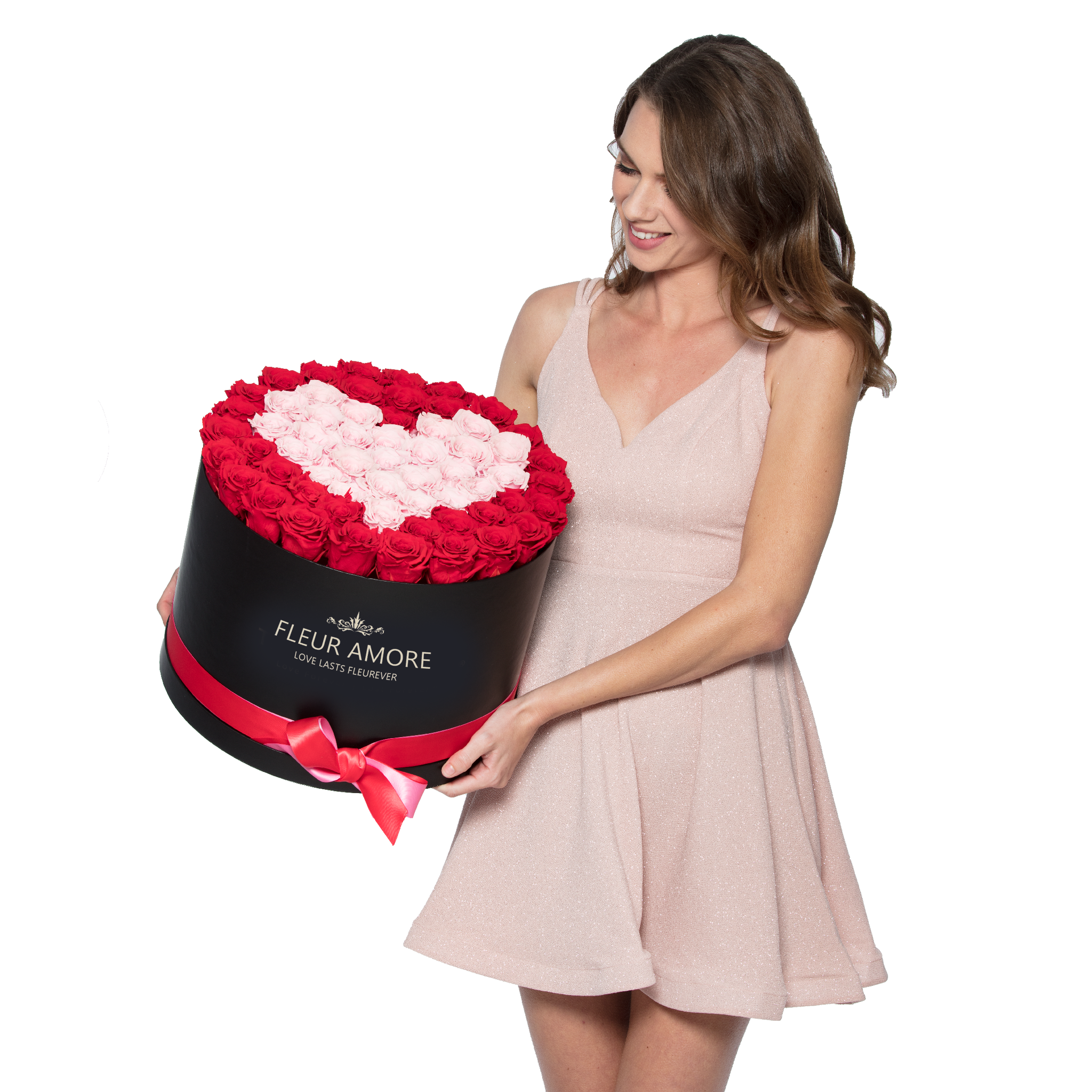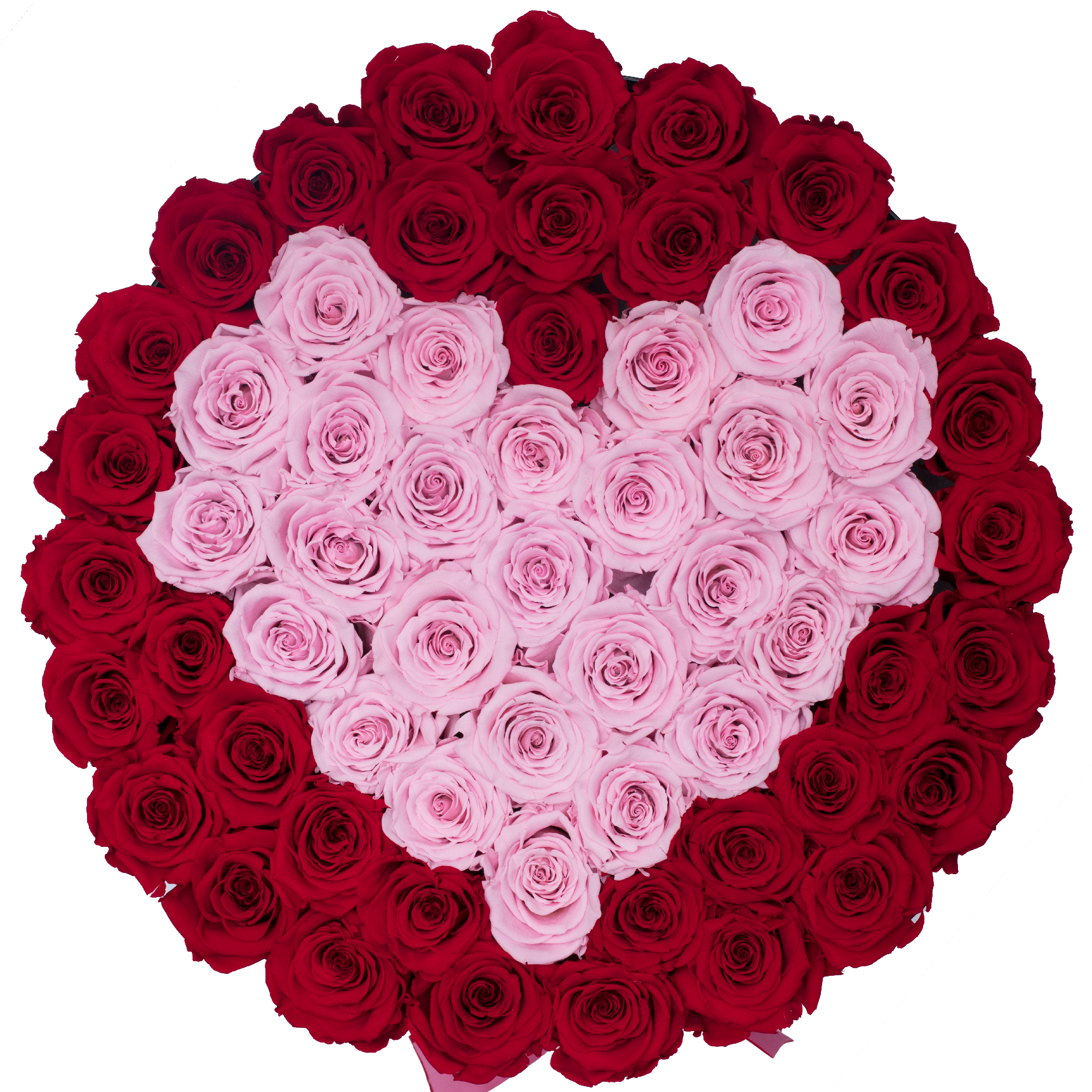 Red and Light Pink Heart Preserved Roses | Large Round Black Huggy Rose Box