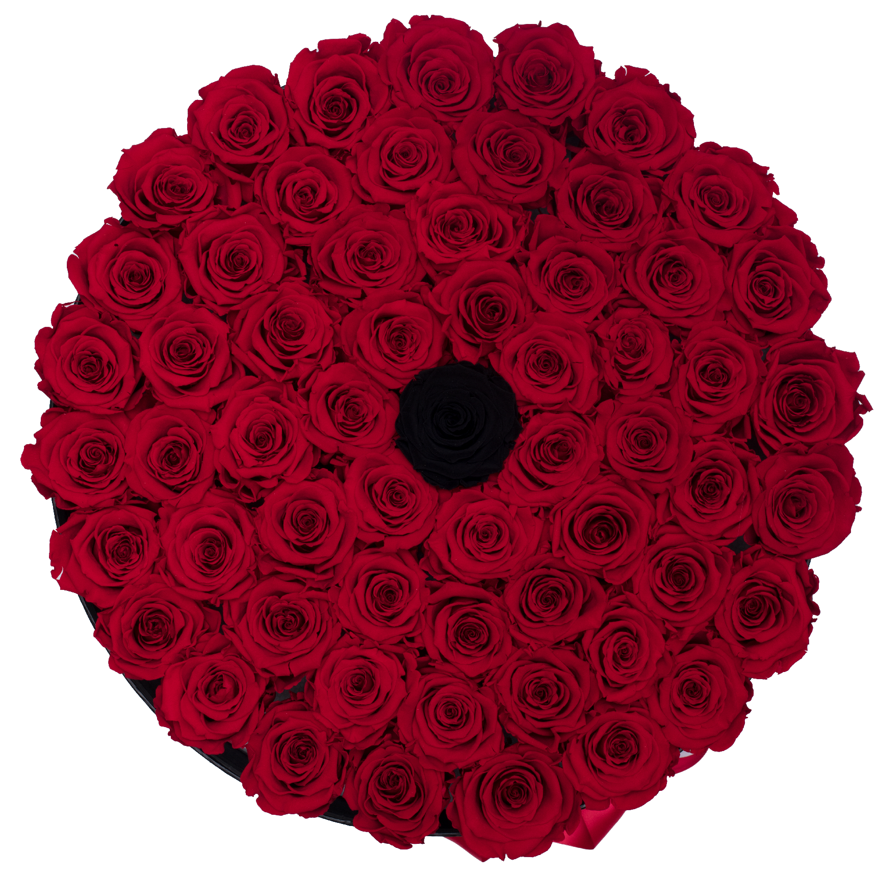 Everlasting Rose® color: Red and Black Number of Everlasting Rose®: 60 ~ 65 roses Rose box diameter: 15 in Rose box height: 10 in Rose box color: Black Everlasting Rose® diameter: 2 in