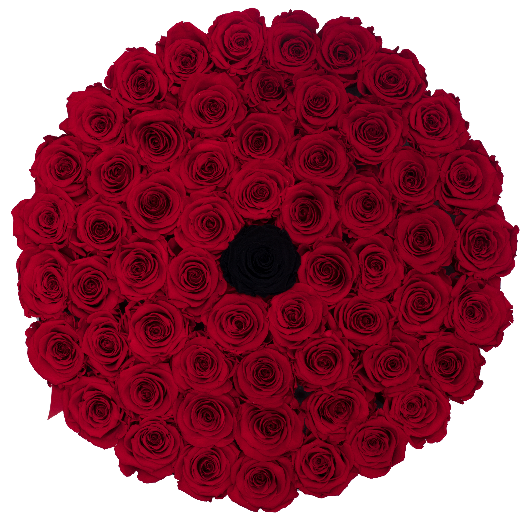 Everlasting Rose® color: Red and Black Number of Everlasting Rose®: 60 ~ 65 roses Rose box diameter: 15 in Rose box height: 10 in Rose box color: White Everlasting Rose® diameter: 2 in