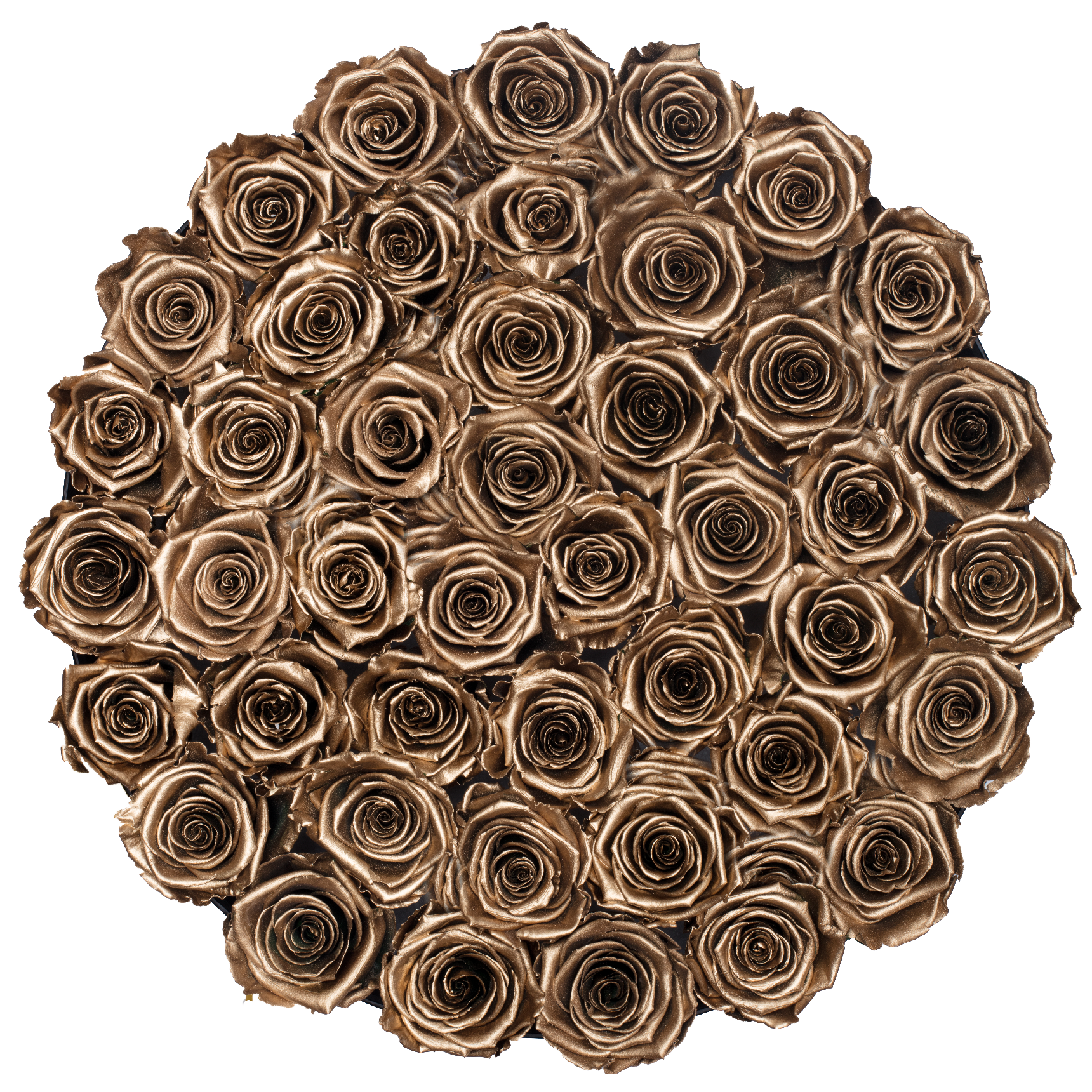 Everlasting Rose® color: Gold Number of Everlasting Rose®: 30 ~ 35 roses Rose box diameter: 10.7 in Rose box height: 10 in Rose box color: Black Everlasting Rose® diameter: 2 in