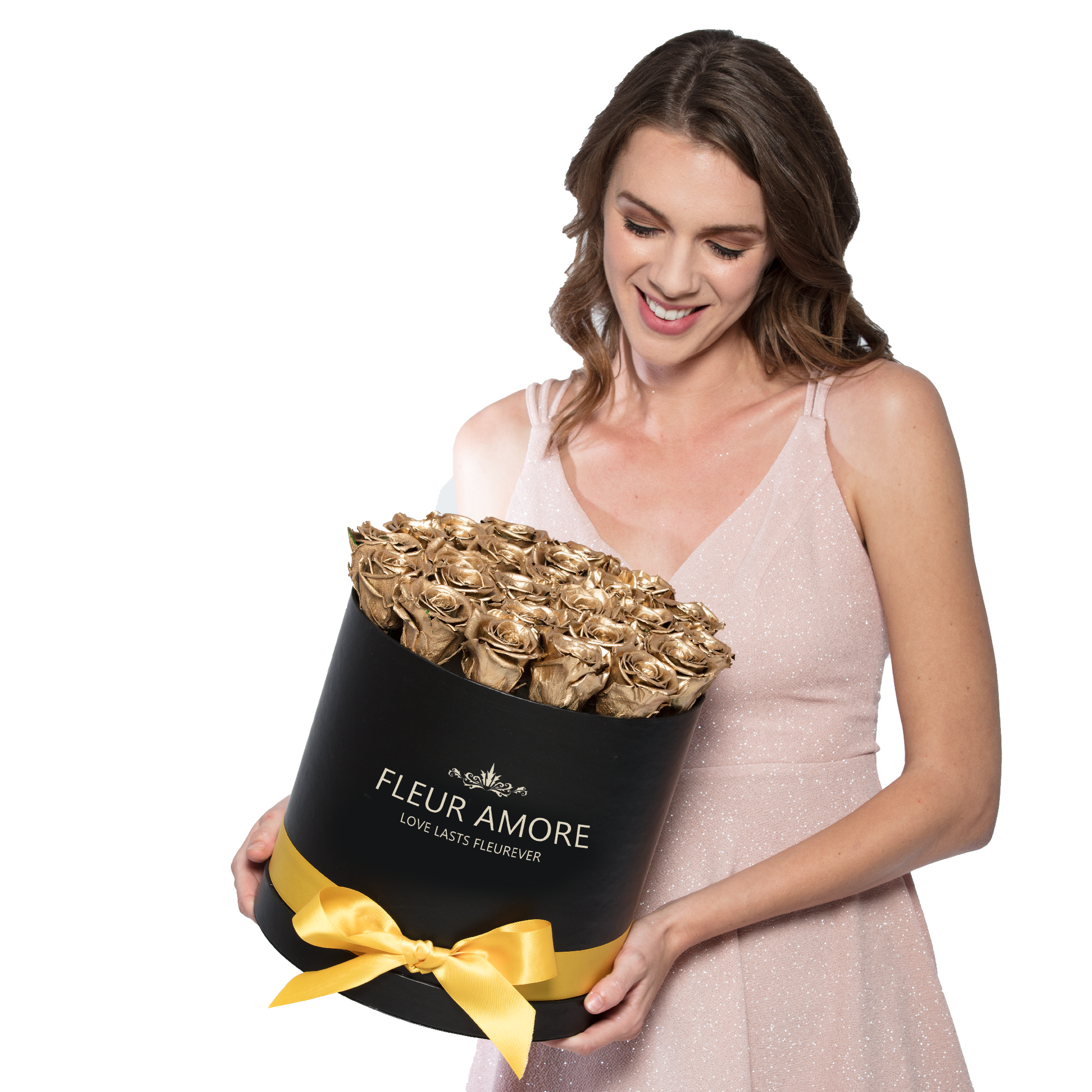 Gold Preserved Roses | Medium Round Black Huggy Rose Box