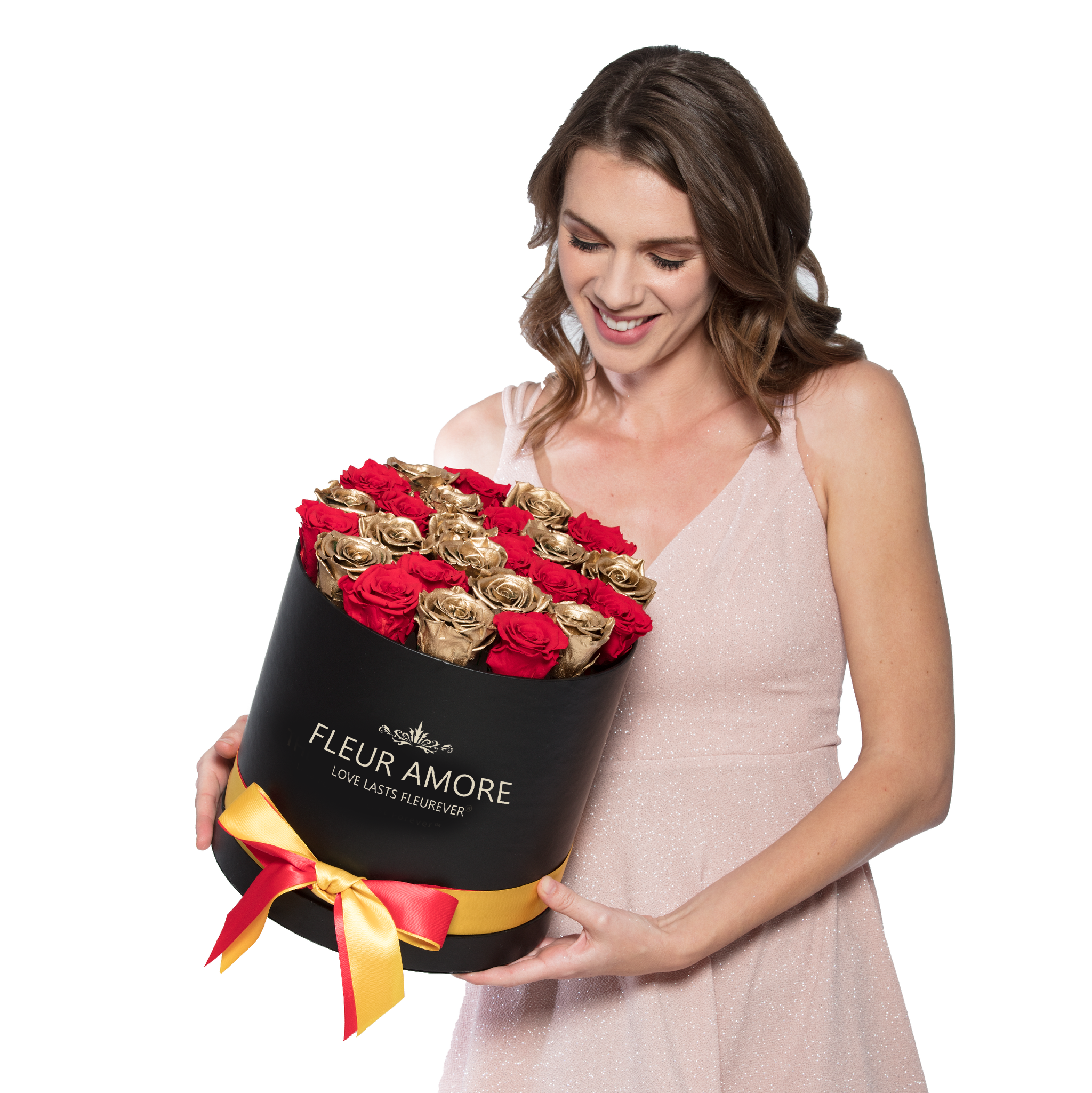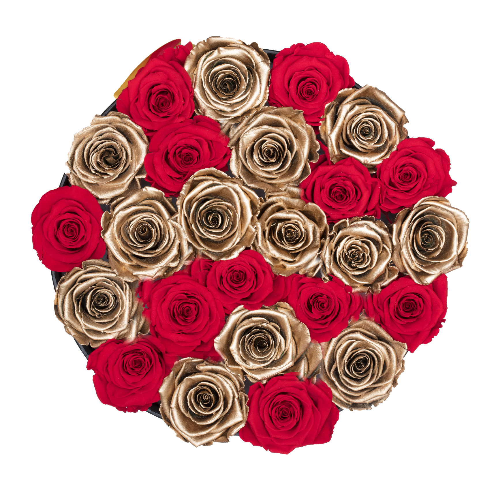 Everlasting Rose® color: Red and Gold Number of Everlasting Rose®: 30 ~ 35 roses Rose box diameter: 10.7 in Rose box height: 10 in Rose box color: Black Everlasting Rose® diameter: 2 in