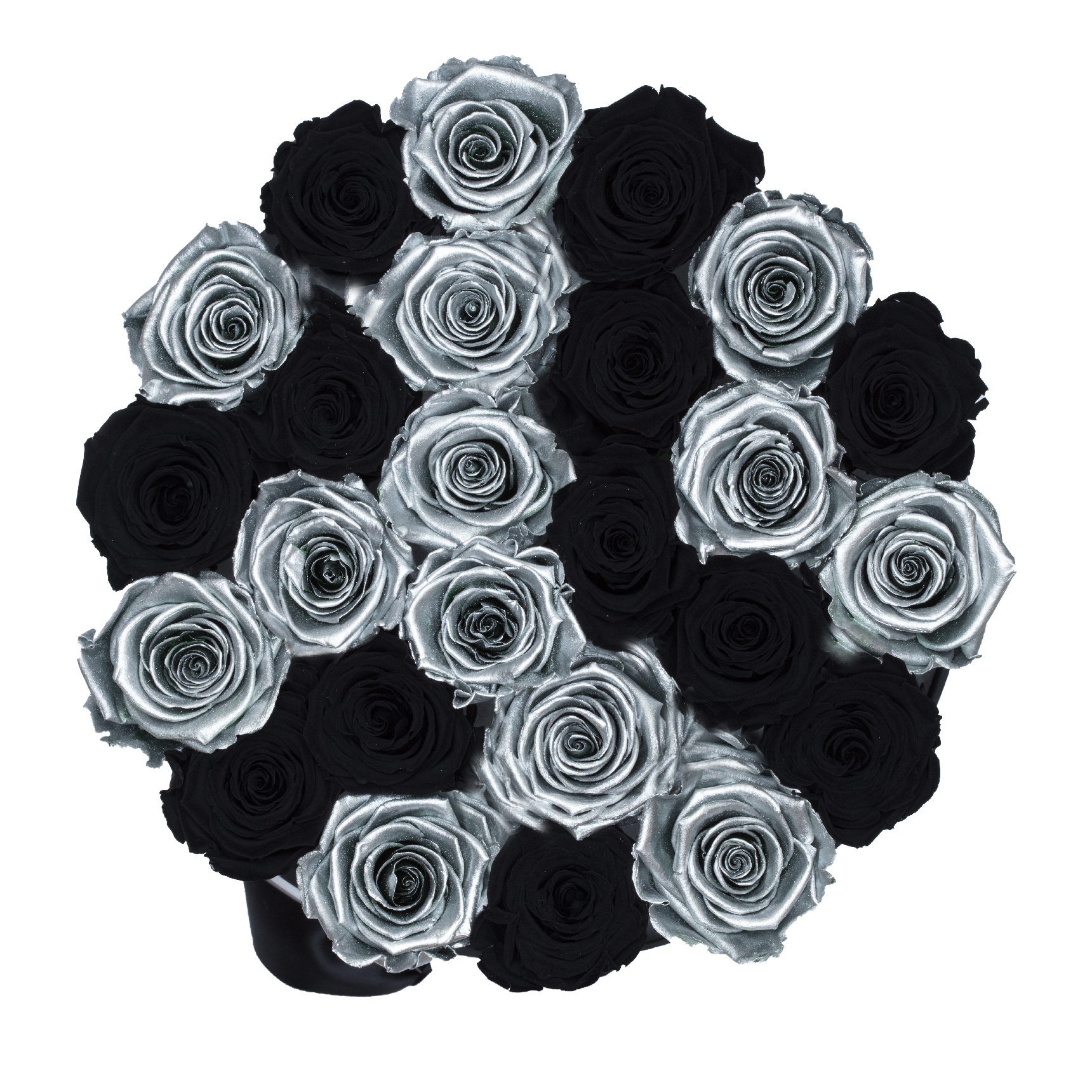 Everlasting Rose® color: Silver and Black Number of Everlasting Rose®: 30 ~ 35 roses Rose box diameter: 10.7 in Rose box height: 10 in Rose box color: White Everlasting Rose® diameter: 2 in