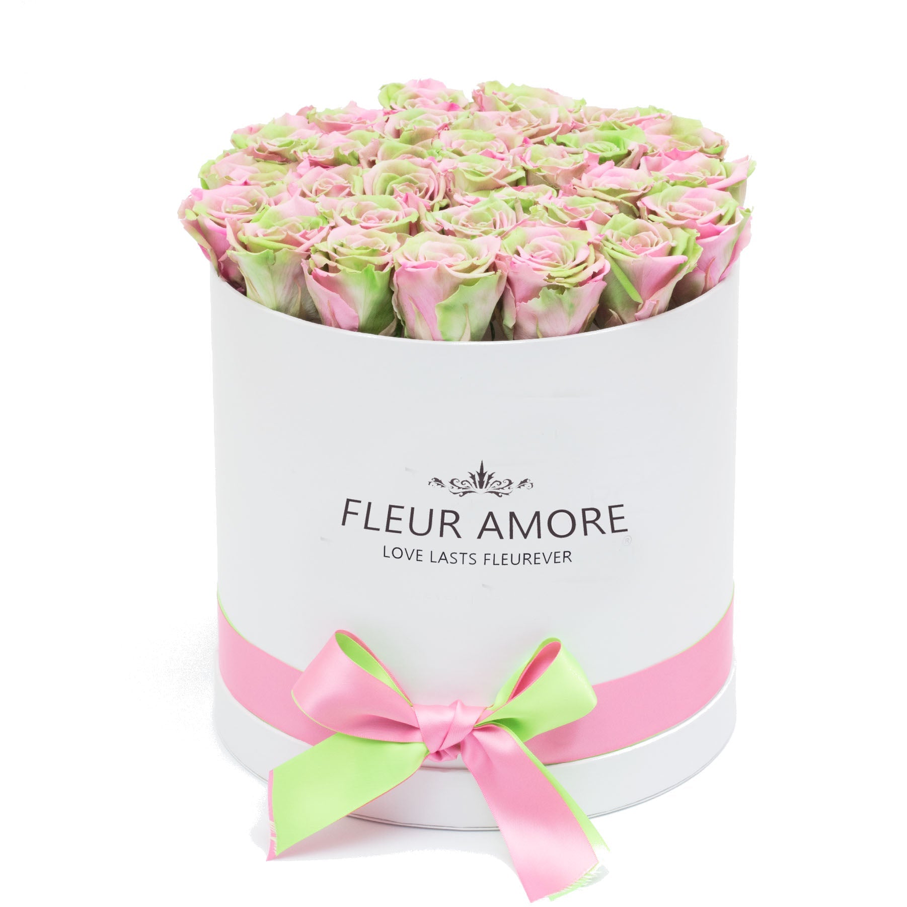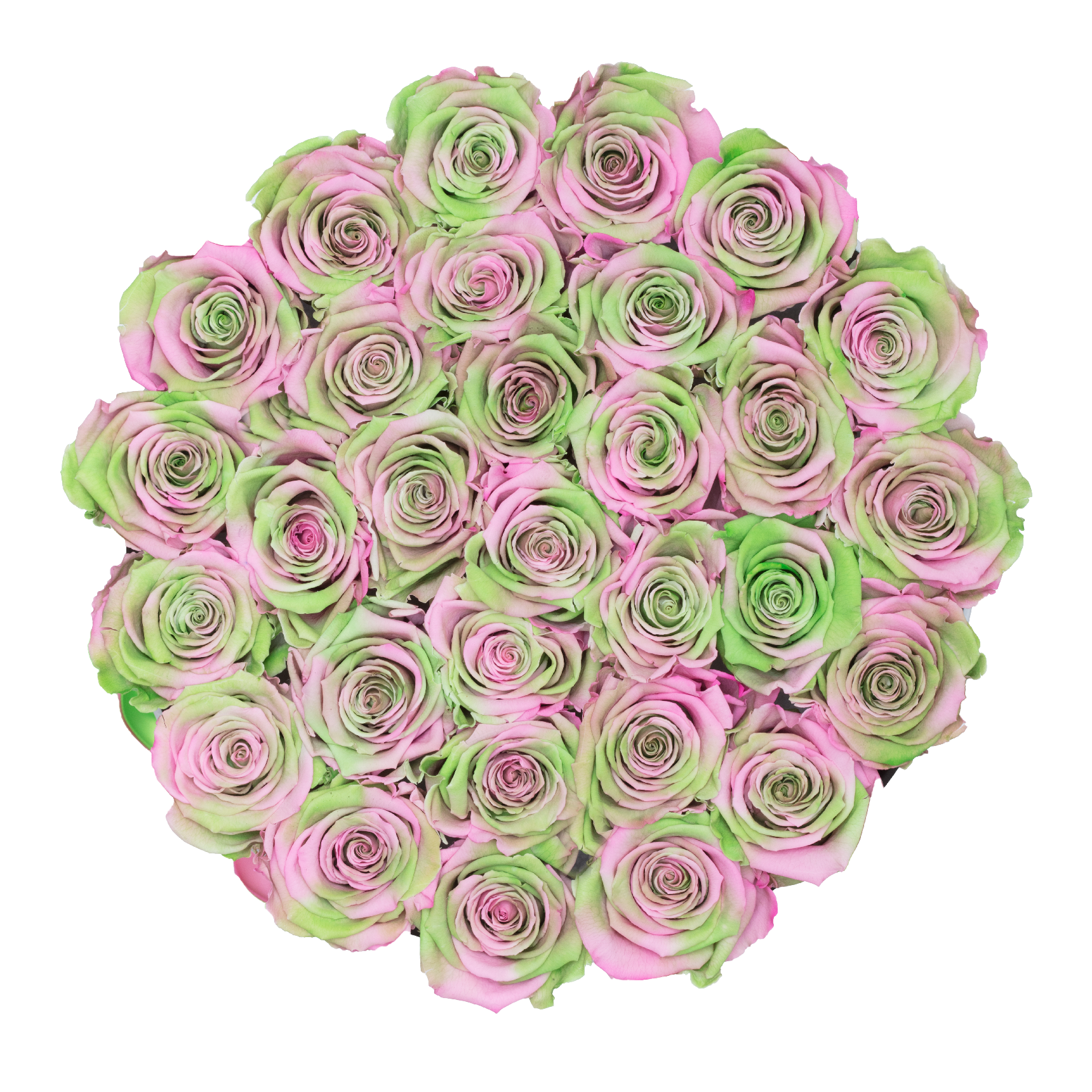Green & Pink Mix Preserved Roses | Small Round White Huggy Rose Box