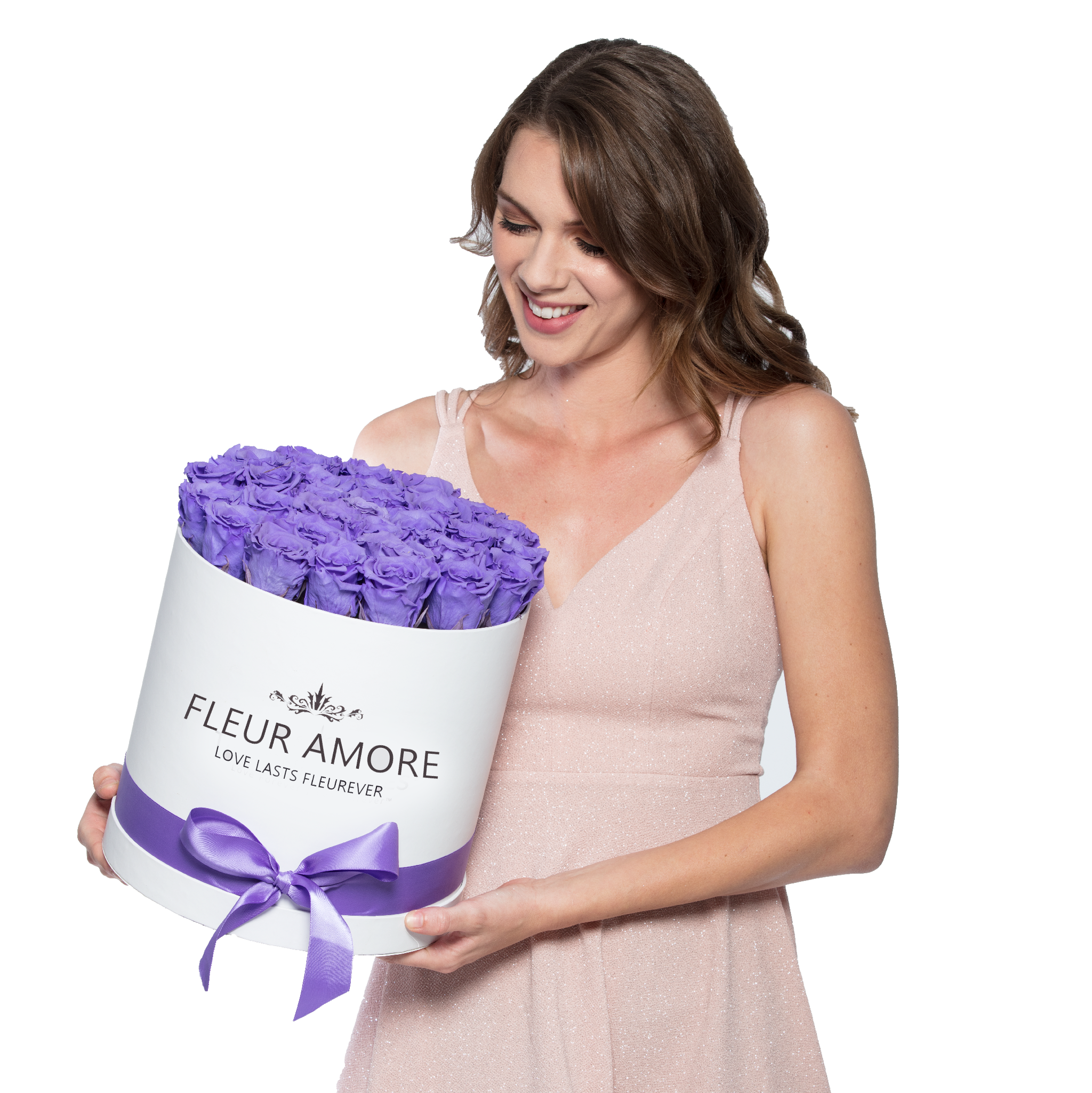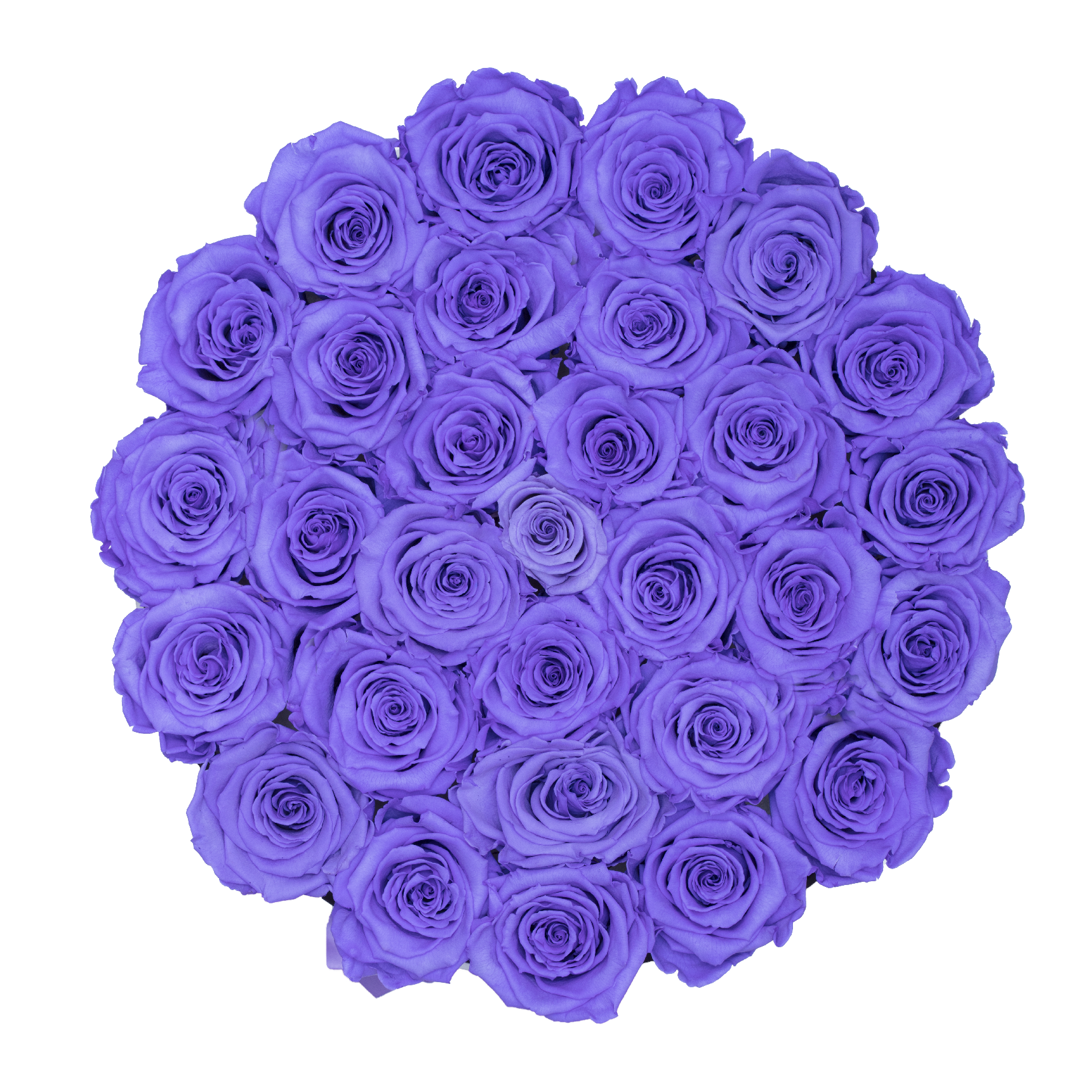 Everlasting Rose® color: Purple Number of Everlasting Rose®: 30 ~ 35 roses Rose box diameter: 10.7 in Rose box height: 10 in Rose box color: White Everlasting Rose® diameter: 2 in