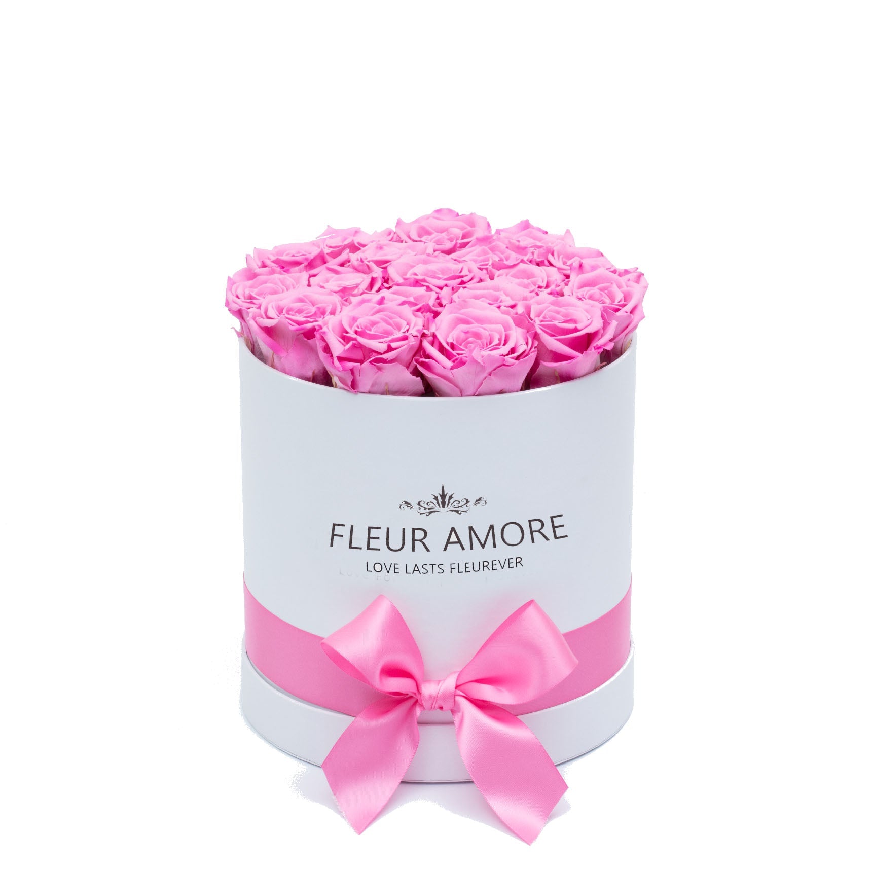Pink Preserved Roses | Small Round White Huggy Rose Box