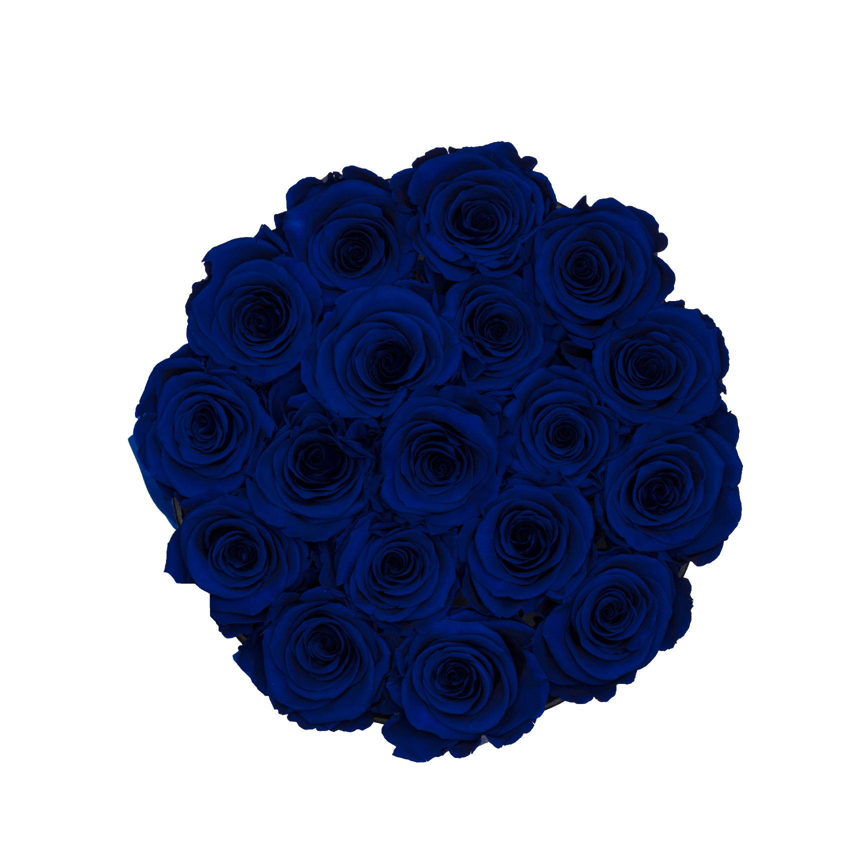 Everlasting Rose® color: Royal Blue Number of Everlasting Rose®: 18 ~ 20 roses Rose box diameter: 8 in Rose box height: 8 in Rose box color: Black Everlasting Rose® diameter: 2 in