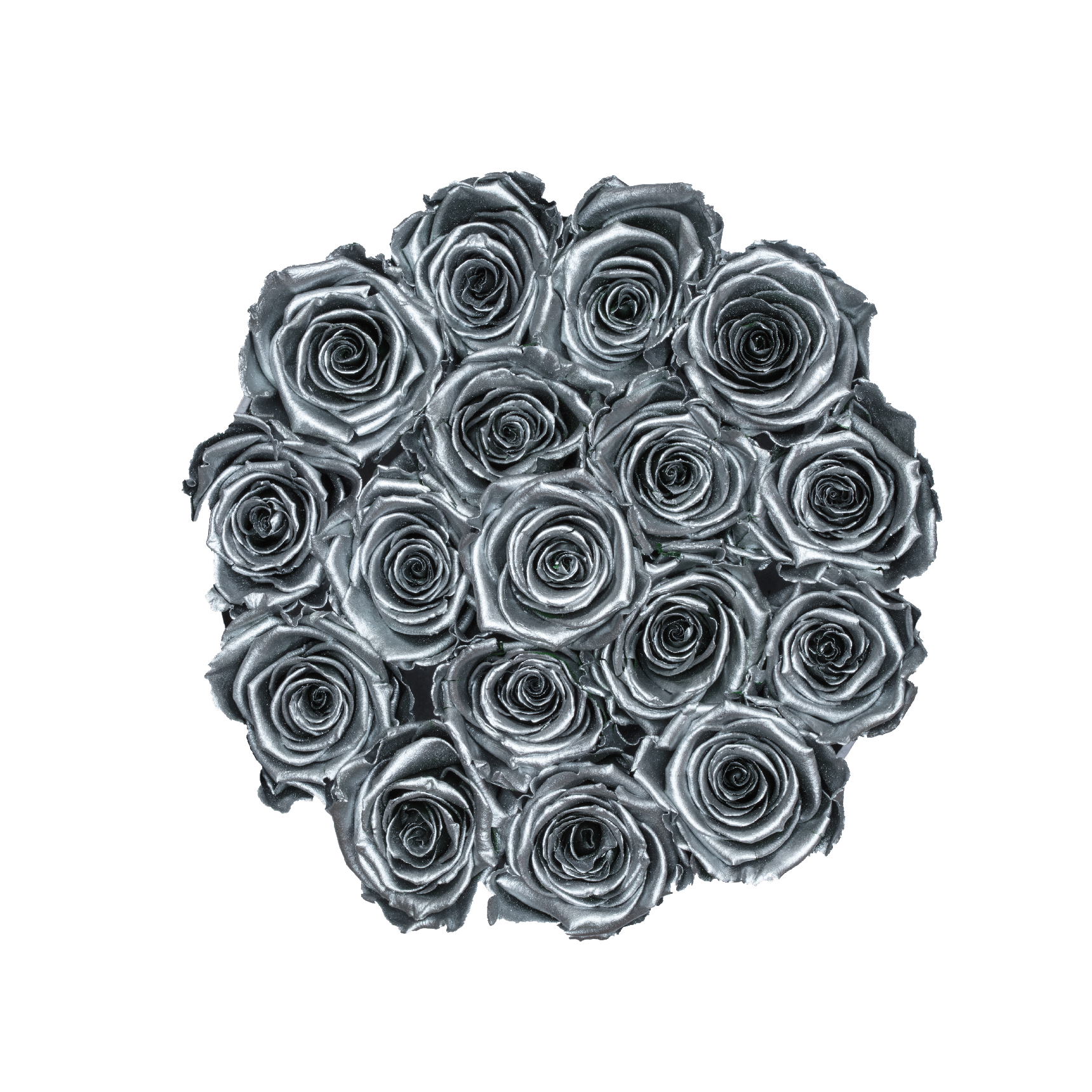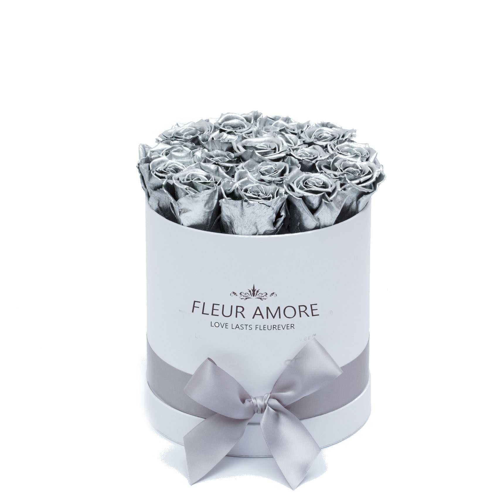 Everlasting Rose® color: Silver Number of Everlasting Rose®: 18 ~ 20 roses Rose box diameter: 8 in Rose box height: 8 in Rose box color: White Everlasting Rose® diameter: 2 in