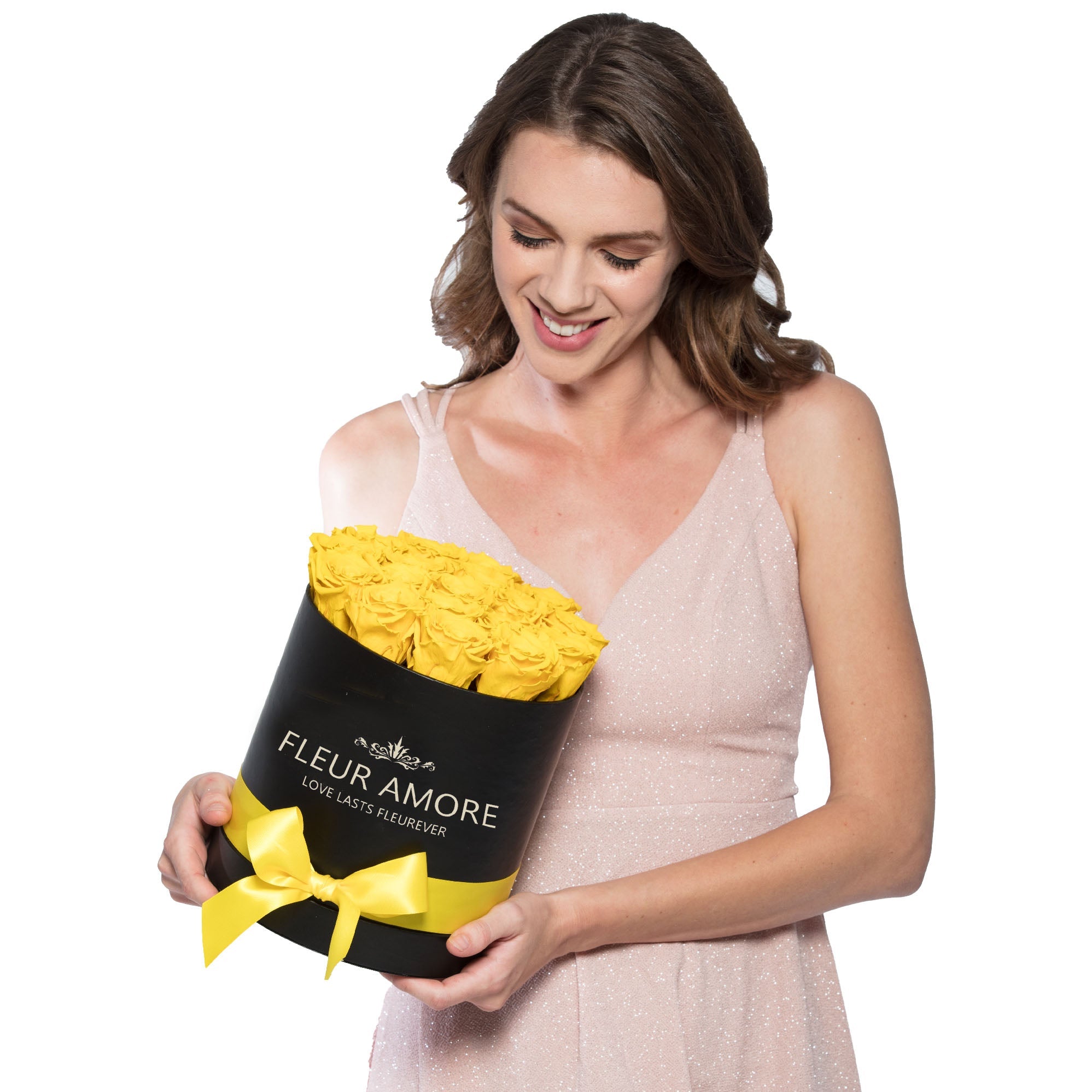 Yellow Preserved Roses | Small Round Black Huggy Rose Box